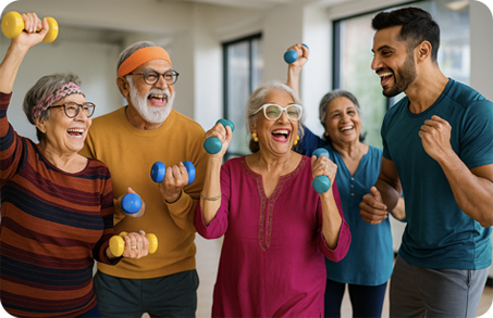 We have been married for twenty fabulous years, by profession we are Health-Tech entrepreneurs. The vision of this club began with seeing our own parents growing old, eventually loosing Harman's father to complications arising from a fall. My father losing muscle strength and getting forced to use a walker as a walking aid. Seeing every senior battling some form of mobility issues arising due to low muscle strength and lack of balanced diet awareness. We moved to New York for one year and at the back of my mind, I constantly worried about my parents and their well being. It's not just their mobility or strength issues, it's the general feeling of lonliness, lack of initiative, social withdrawl, that most seniors develop as they grow older. I felt there is a serious need to create awareness in our elders, to build muscle, raise their prana, go back to being joyful and strong. This passion of uplifting our seniors led to the foundation of the Chardi Kala Club.